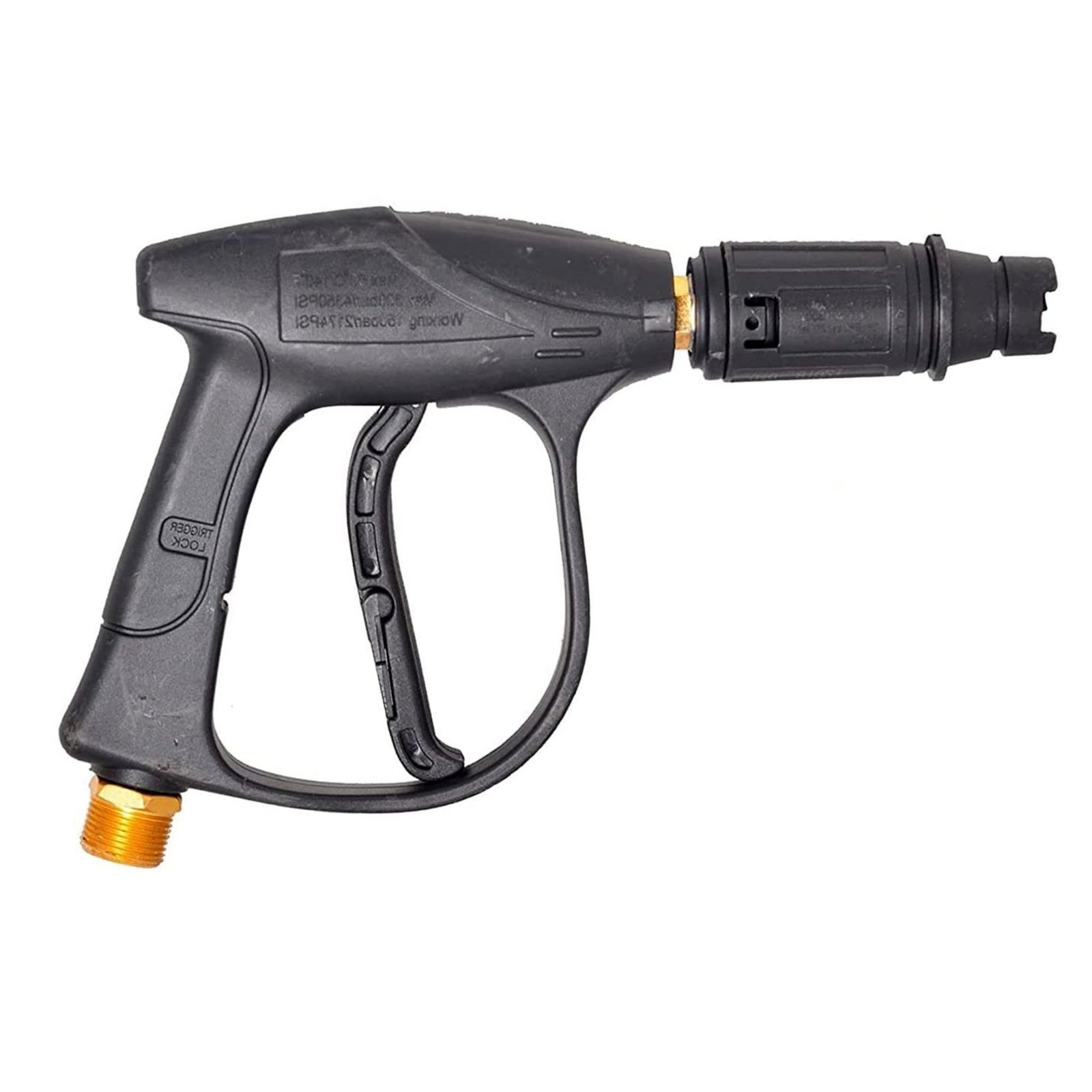 Durable high-pressure washer spray gun designed for powerful and precise cleaning. Made with a sturdy plastic body and brass connector, it ensures leak-free performance and a comfortable grip.